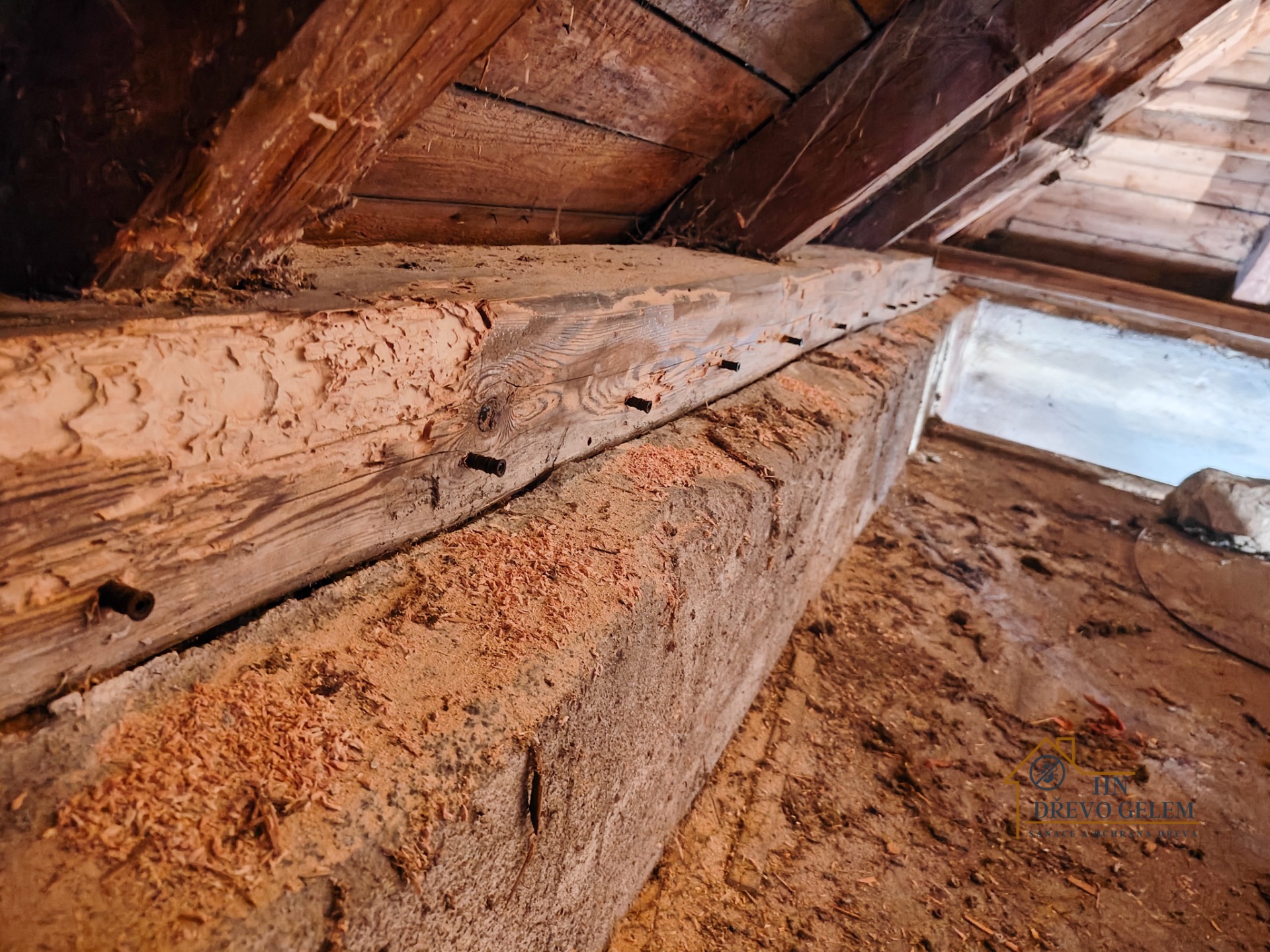 - Světlé piliny: Pod trámy se objevují hromádky požerků (dřevěného prachu).